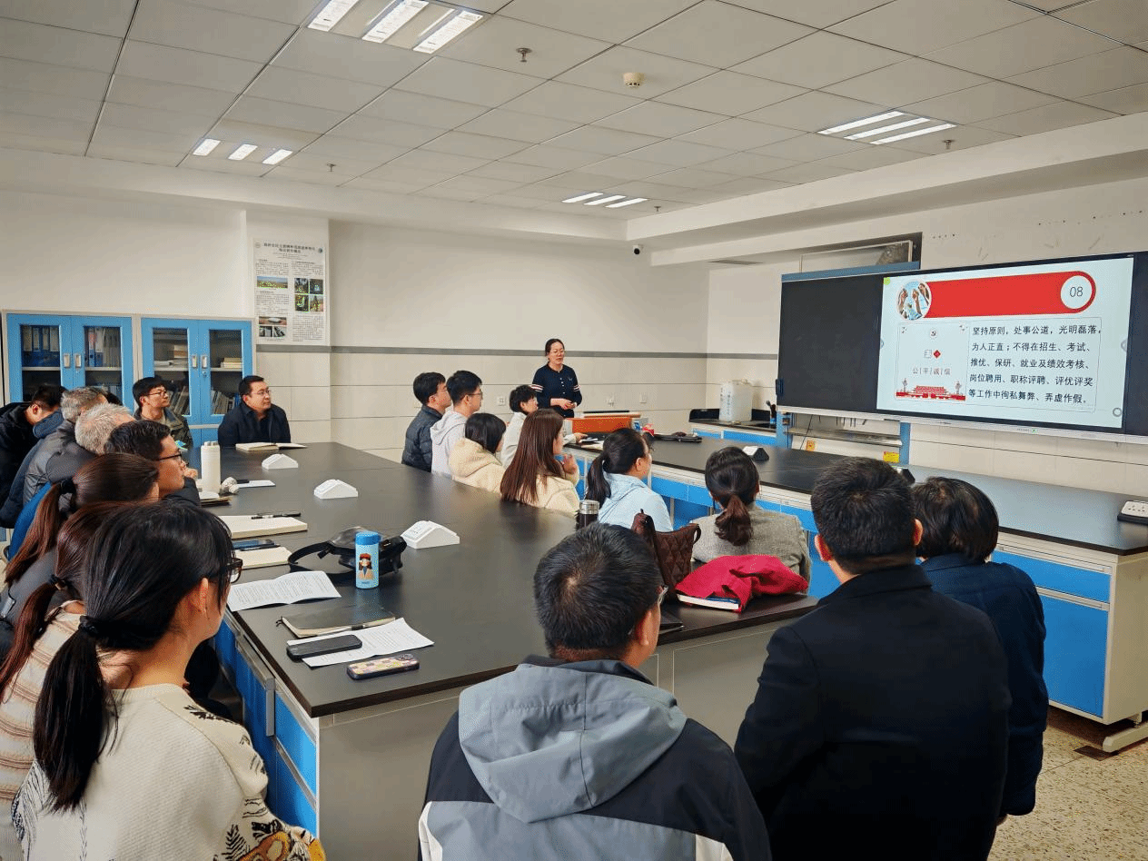 赵杏花带领全体教师逐条学习了《新时代高校教师职业行为十项准则》,重点围绕“坚定政治方向、自觉爱国守法、传播优秀文化、潜心教书育人、关心爱护员工、坚持言行雅正、遵守学术规范、秉持公平诚信、坚守廉洁自律、积极奉献社会”十项内容展开解读。会议强调,全体教师要深刻领会准则的核心要义,将其内化为行动自觉,切实做到以德立身、以德立学、以德施教,争做新时代“四有”好老师。《准则》为教师职业行为划定了“基线”,也提出了更高要求。我们要在课堂教学中融入思政元素,引导员工树立正确价值观。作为科研工作者,必须严守学术规范,以身作则培养员工严谨求实的科学精神。与会教师一致认为,准则不仅是职业规范,更是育人使命的指引,需在日常教学中践行落实。
